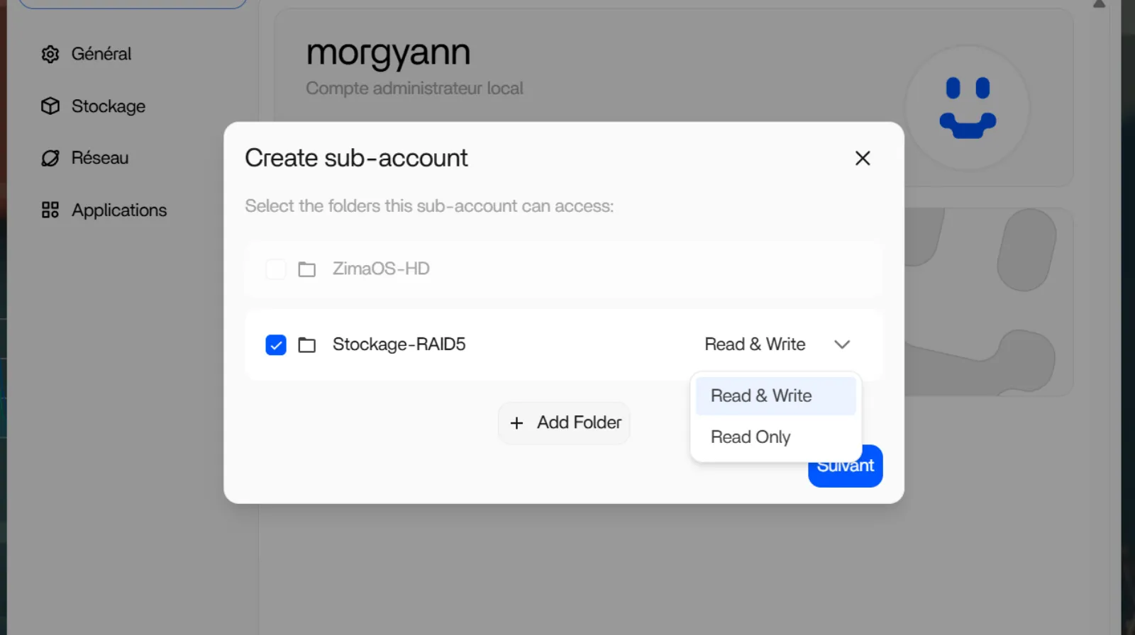 Sélectionnez un espace de stockage dédié au nouvel utilisateur. Par défaut, le volume contenant AppData, données des applications et de l’OS n’est pas autorisé. Vou pouvez aussi créer un dossier dédié à l’utilisateur. Autorisez lecture-écriture ou seulement lecture et, Suivant