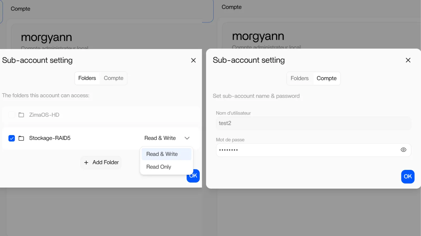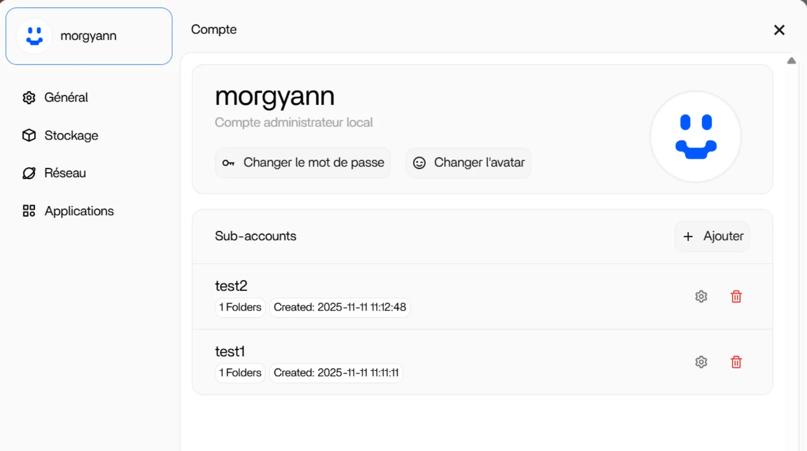 Vous pourrez à tout moment, en cliquant sur l’icône engrenage, gérer l’accès aux dossiers ainsi que modifier le mot de passe des utilisateurs créés. Le nom n’est plus modifiable. Le compte peut être supprimé avec l’icône Corbeille.