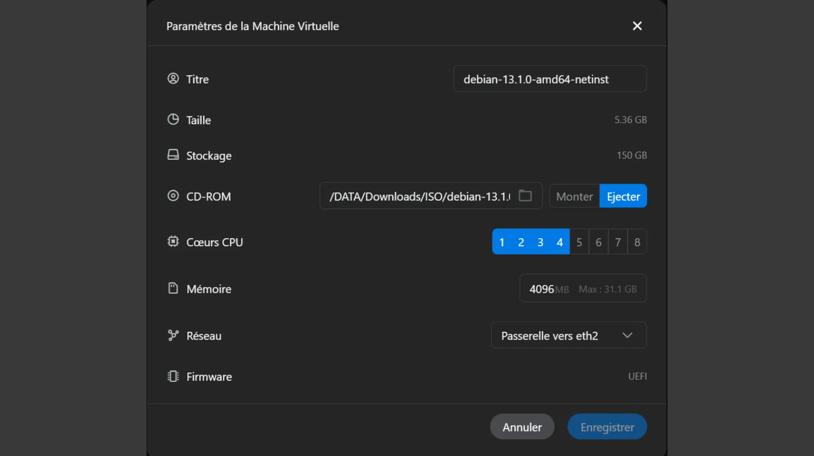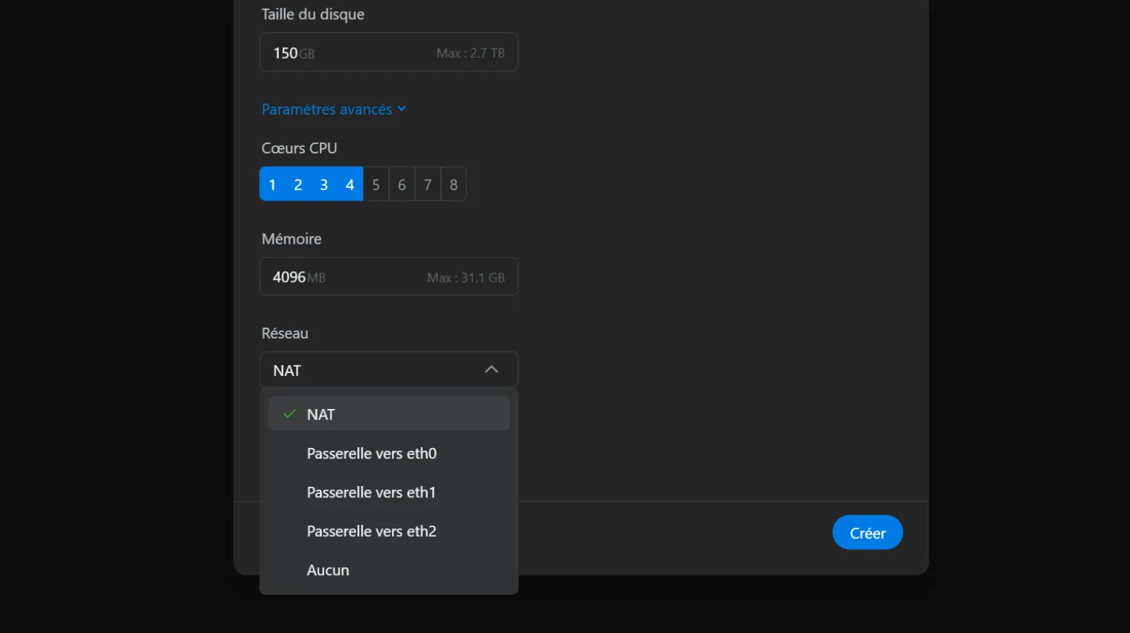 Suivez le tutoriel Créer une VM en NAT jusqu’au point 4. Les paramètres – et déployez Paramètres avancés et choisissez la passerelle active – pour ce tuto c’est Passerelle vers eth0