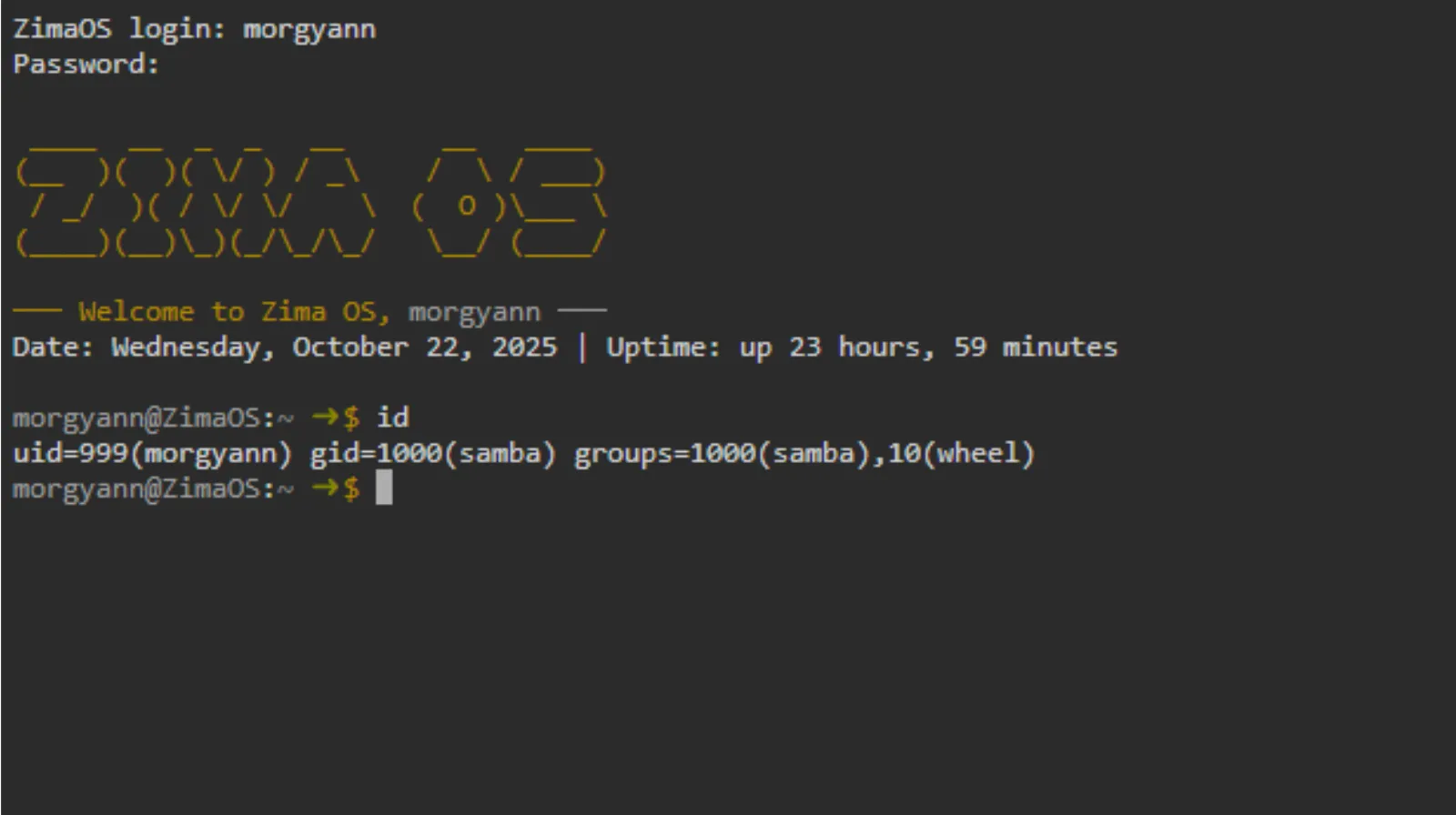 Sur ce ZimaOS, l’UID est 999 et le GID est 1000